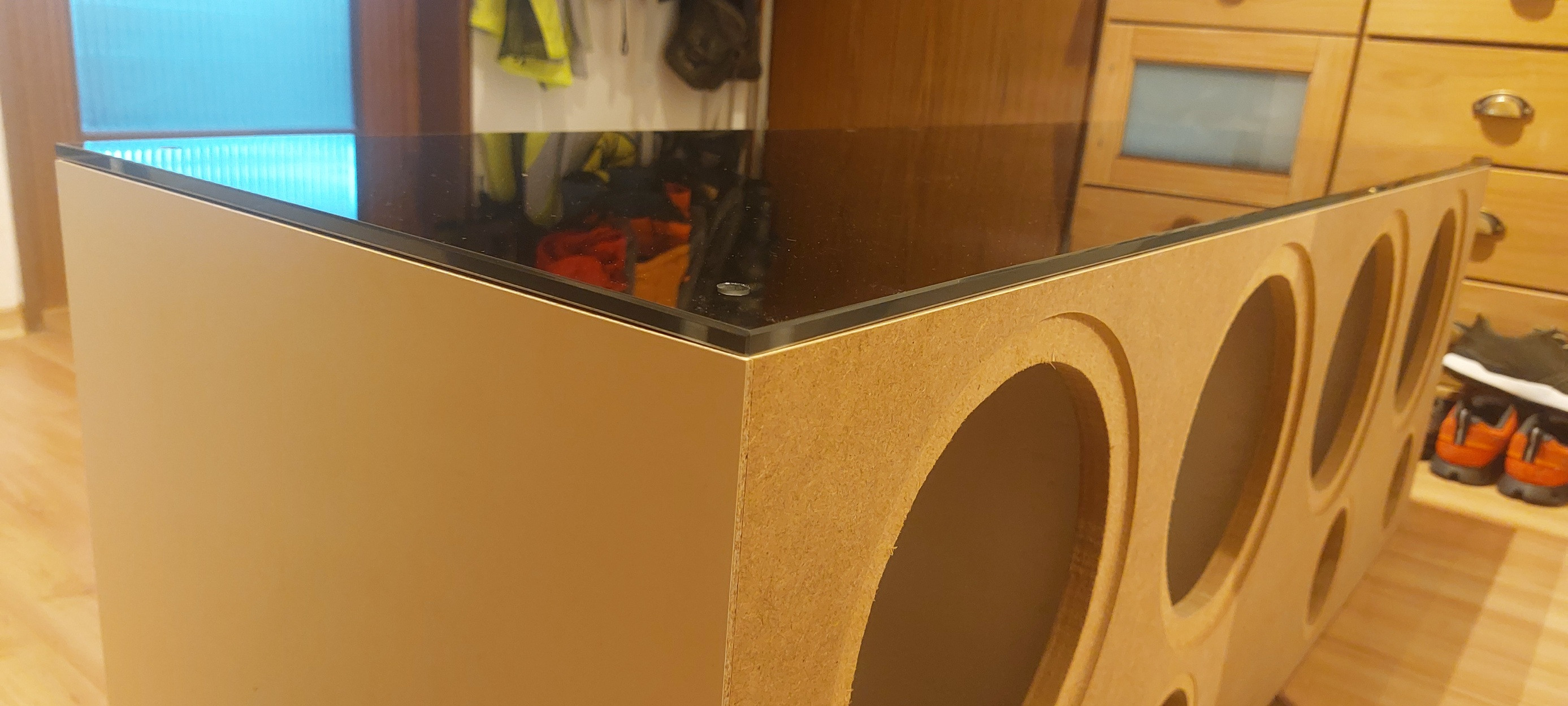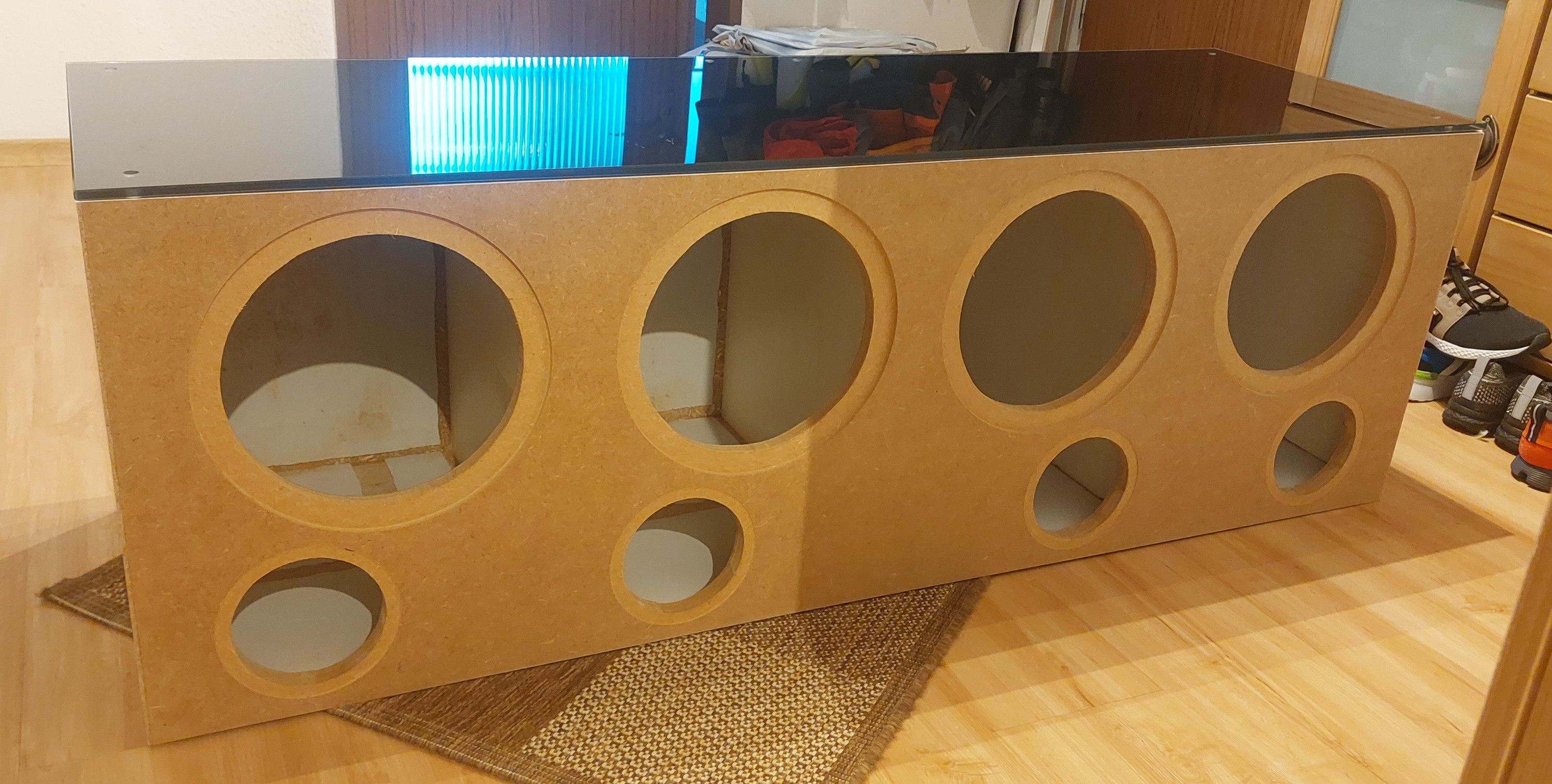 Hoffe es passt alles mit der Winkligkeit wenn die Glasplatten oben und unten dazukommen. Die Tiefe passt momentan, die Breite muss noch entsprechend mit dem letzten Seitenteil angepasst werden. Das Tieftongehäuse wird liegend bleiben, Rollen auf Holzplatte --》darauf eine Glasplatte --》 darauf das Tieftongehäuse --》 darauf wieder eine Glasplatte --》darauf die beiden "Satelitten" --》darauf die dritte Glasplatte. Dazwischen je eine Lage Antirutschmatte welche eigentlich unter Teppiche kommt zur Dämpfung um Klappern zu vermeiden. Eine Art Highboard mit Lautsprechern voll.