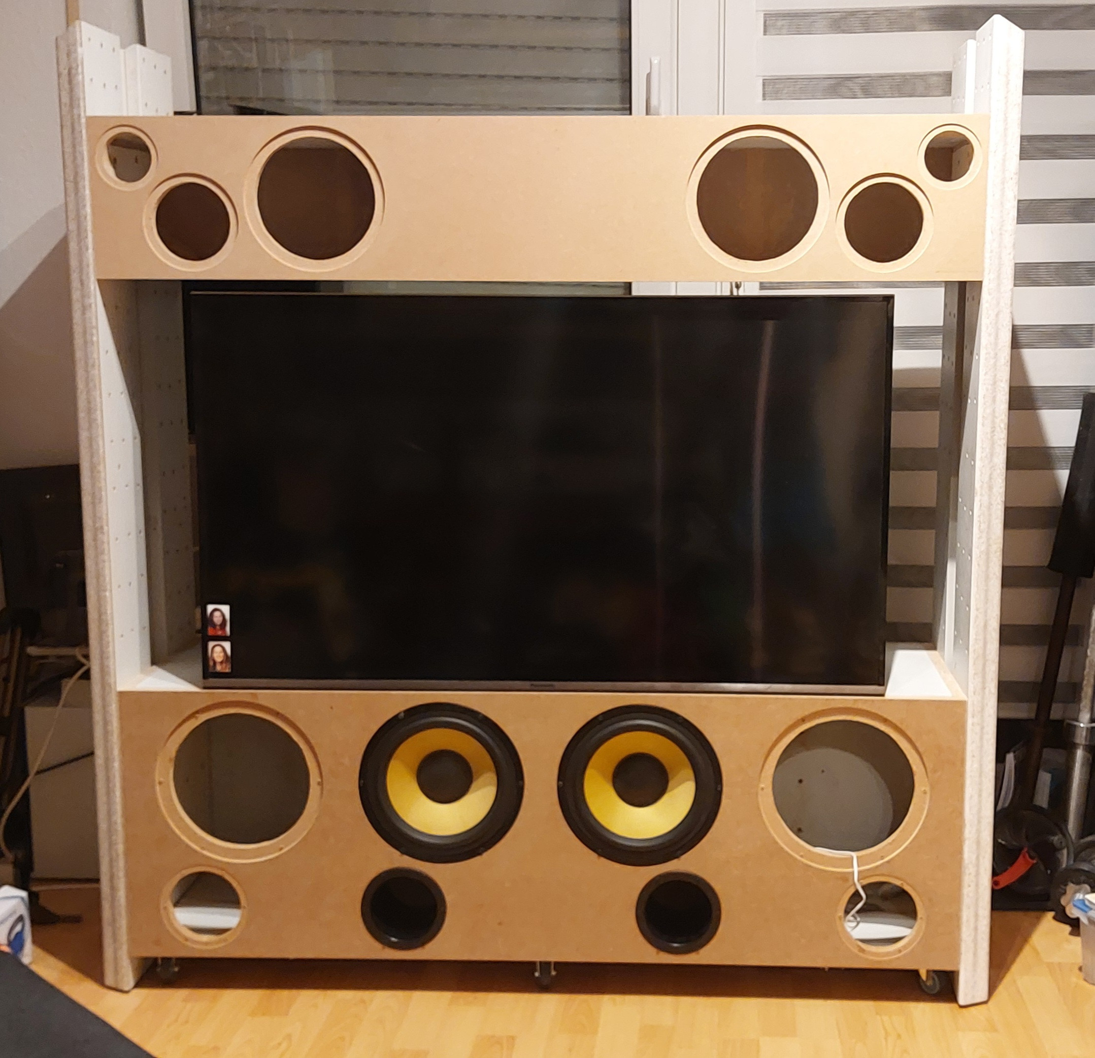 Hab das Ding vorhin im Rohbau zusammengeschraubt. Erst mal die Seitenwände des Tieftongehäuses noch verschraubt da dies nur geleimt war, dieses muss nun die Seitenträgerwände und das Mittelhochtongehäuse mittragen.