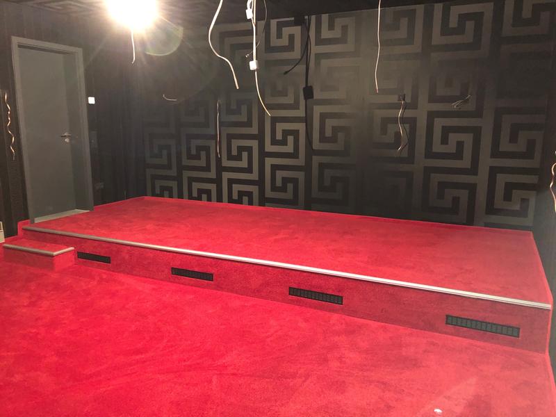 Als Bodenbelag einen schönen, roten Velourteppich.