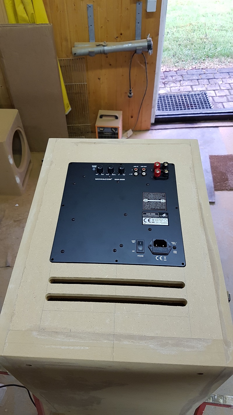Die Atlanten werden teilaktiv mit Hifi-Akademie betrieben; die Subs aktiv mit Monacor SAM-500D Einbaumodulen (mit vorgeschaltetem Mini-DSP).