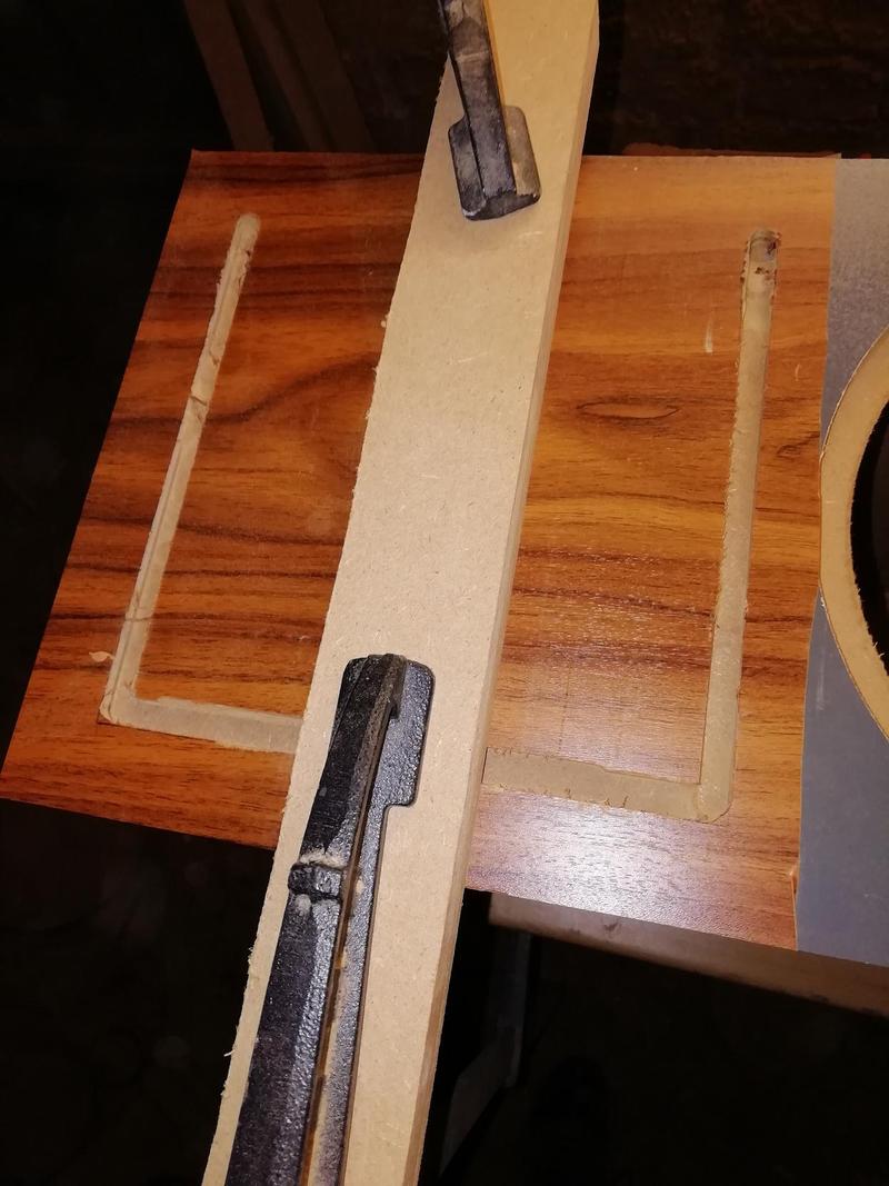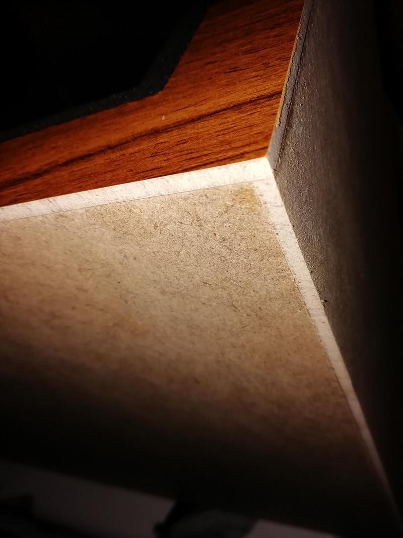 Noch ist erst die Front mit Folie bezogen, in Nussbaum, wegen der 3mm HDF Platten kommt der Rest erst in paar Monaten dran, wenn das Quellen der Deckplattenaufgehört hat und abgeschliffen wurden. Wenn dann kommt nur eine sehr kleine Fase ringsum dran, 3mm für eine gefälligere Optik, auch das wird erst entschieden wenn es soweit ist.