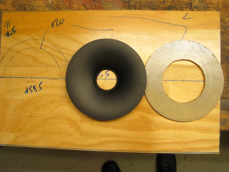 Die WSP's brauchen nur ab 60 Hz laufen, darunter übernehmen 2 Ripole mit je 4 WSP26S. Aus diesem Grund bekam auch jeder WSP21S nur 23 Liter Nettovolumen geschlossen, je in eigenem Abteil. Sollte der Druck untenrum nicht reichen kann per Bassreflex noch einiges an Pegel herausgeholt werden, das wird sich zeigen. Wäre das HT21 nicht gekommen, würde hier nun ähnliches stehen vom Gehäuse, nur mit den DSM Kalotten. So kann es gehen, das Horn warf alles andere über den Haufen.
