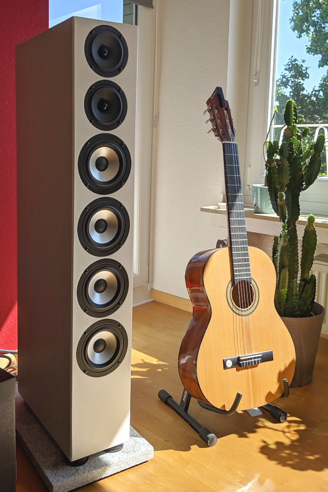 . Dabei handelt es sich um eine Kombination aus 4 x AL130 und 2 x B100 in einer geschlossenen Standbox - angelehnt an die Visaton Quintett. Ich habe ihr den Namen "quattro due" gegeben.Die Idee ist mir beim letzten Forumstreffen bei Visaton gekommen, als ich mich auf Grund der tollen Tonalität sofort in den B100 verliebt habe. Ein wirklich fantastisches Chassis, das mich - als erster Breitbänder - in Gänze überzeugt hat. Im Bassbereich braucht es aber dann eben bei gehobenen Pegeln doch noch etwas Unterstützung. Hier fand ich die Quintett in ihrer Optik immer recht attraktiv.