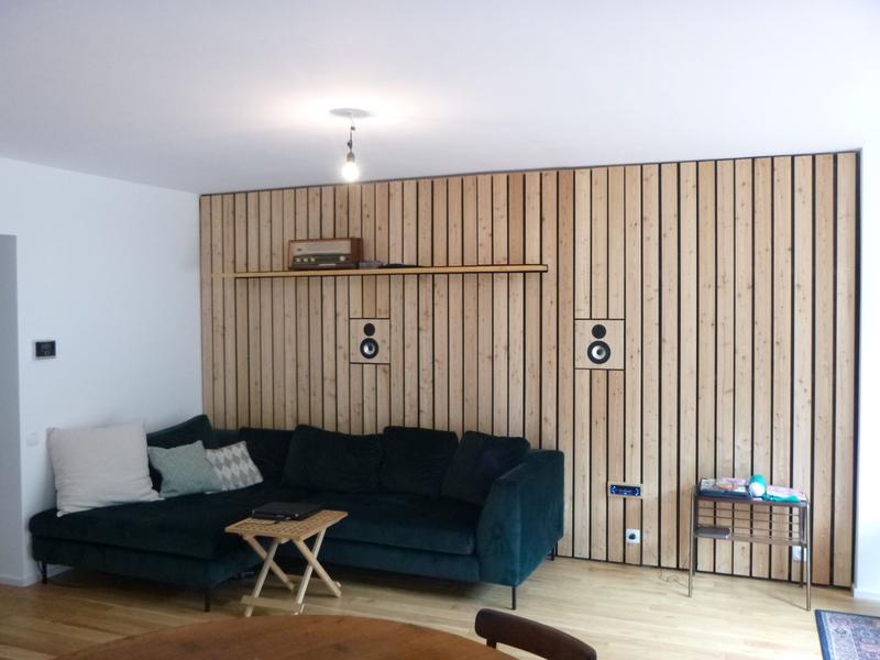 eine kleine Idee hätte ich noch; evtl die Fugen der Vertäfelung als Schattenfuge auf der Schallwand weiterführen, dann sieht man die Boxen fast gar nicht mehr....