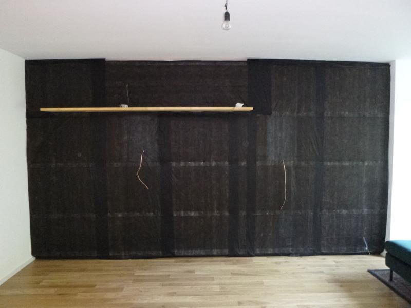 Die Front besteht aus zwei großen Stücken schwarzem Stoff von der Resterampe und davor sind düne weiß beschichtete Spahnplatten (10mm) aus dem Baumarkt zum Quadratmeterpreis. Der Baumarkt hat mir die Streifen gesägt und ich habe dann 2 Abende Umleimer aufgebügelt. Gefüllt sind die beiden Kammern mit Steinwolle (Sonorock), die ich in eine dünne Folie eingewickelt habe.