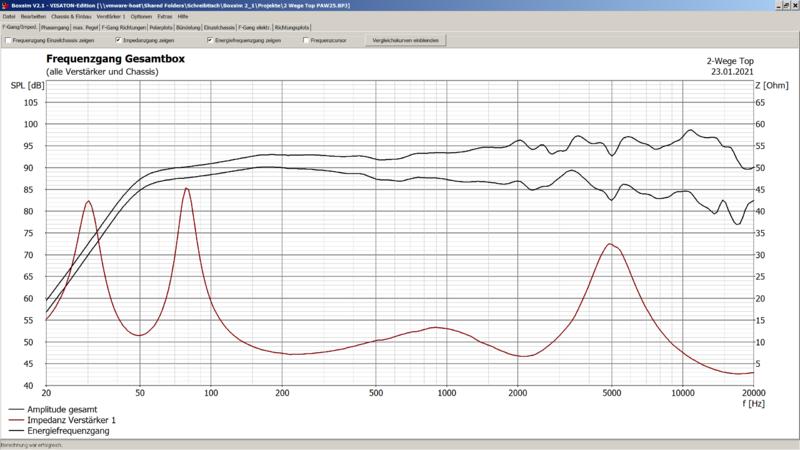 Theoretisch sieht das Ergebnis ganz brauchbar aus. Unschön ist nun die Impedanz oberhalb von 15 KHz. Hoffentlich spielt die Endstufe da mit. Auch der MaxPegel geht in die Knie. Die Teile bis auf die Gehäuse liegen alle hier. Gebaut wird, wenn die Baumärkte wieder öffnen sollten...