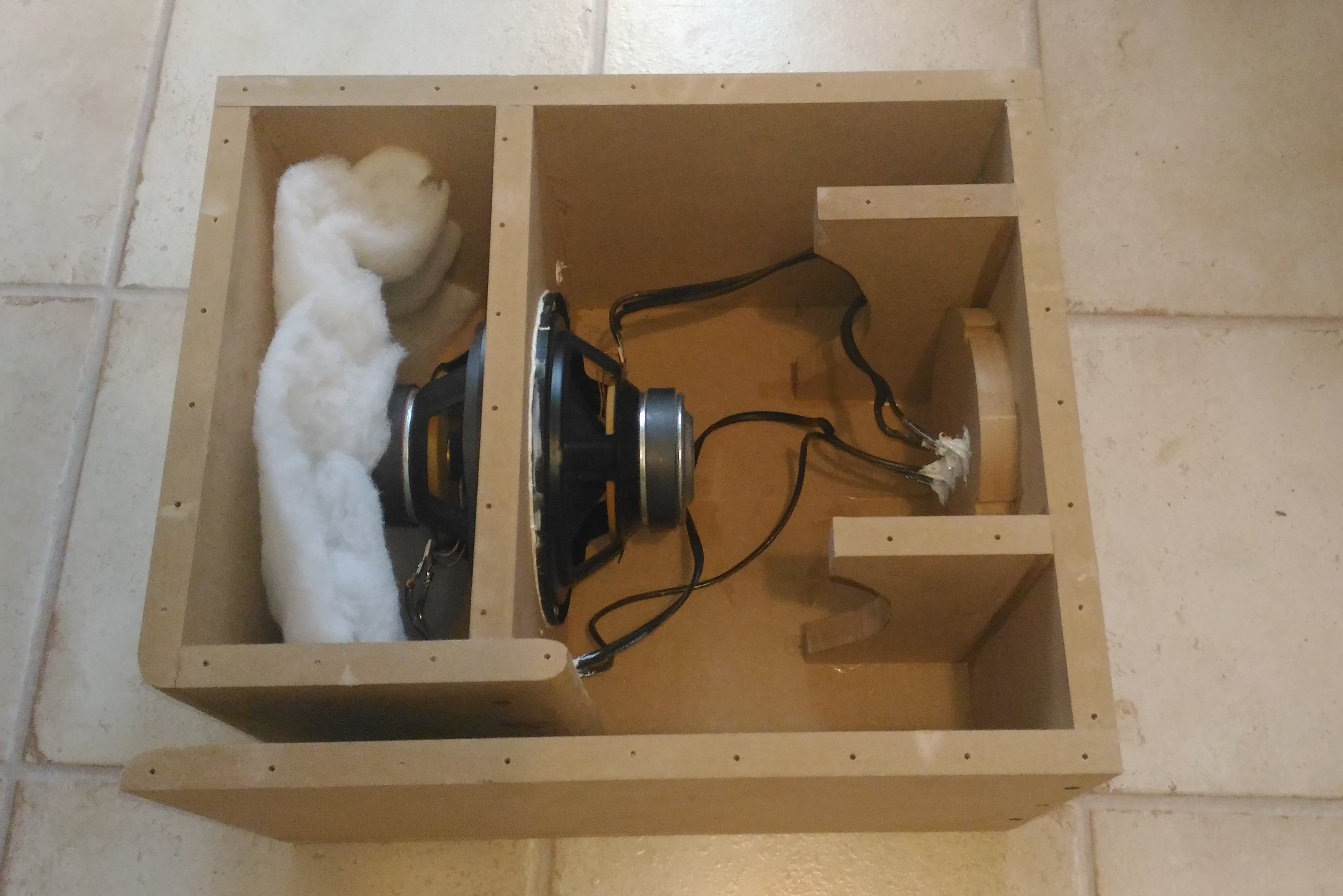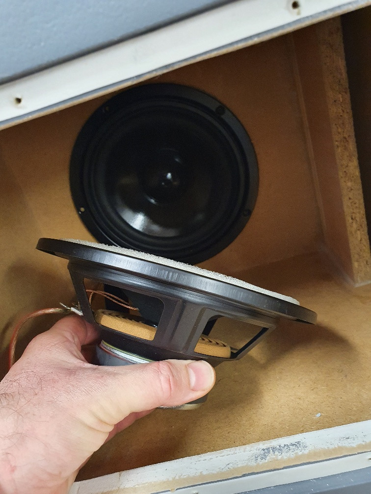 Der Einbau des ersten Tieftöners, der zweite mit Dichtstreifen vorbereitet