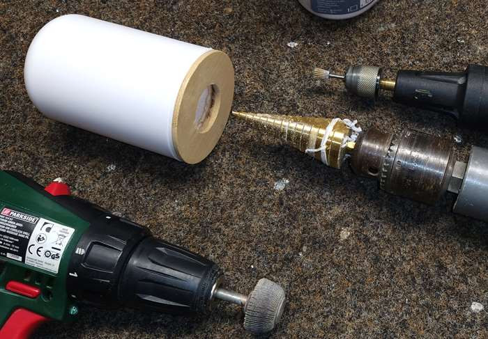 Nun gut , mit einem Blechbohrer wird aus dem Gewinde ein 32mm Loch . Bild 7
