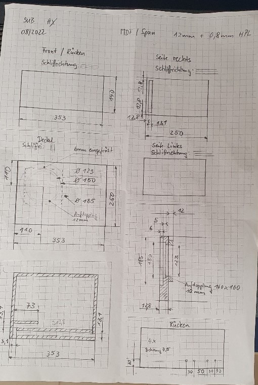 Von den äußeren Abmessungen orientiert sich der kleine Subwoofer an der Picco, er hat die gleiche Höhe und Tiefe wie die Satelliten, das entsprechende Volumen von ca. 7,5 Liter ergibt sich demnach durch die Breite. Somit musste der Treiber nach oben in den Deckel wandern und der entsprechende Reflexkanal mündet an der vorderen rechten Seitenwand. Nicht nur aus optischen Gründen habe ich oben ein Abdeckgitter eingesetzt, damit musste der W130X entsprechend tiefer eingesetzt und eingefräst werden. Damit wurde eine Materialverstärkung durch eine Aufdopplung erforderlich, um Volumensparend zu arbeitet, ist nicht der gesamte Deckel verstärkt, sondern lediglich der Bereich um die Öffnung. Der Kanal faltet sich einmal und geht über die komplett innere Breite der Konstruktion.