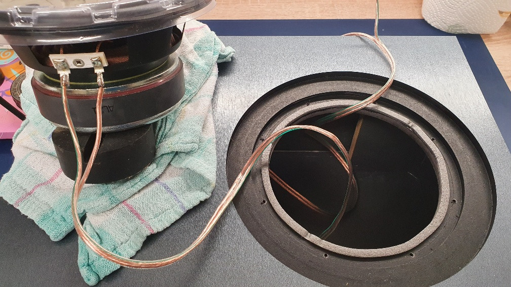 Zum Anschluss habe ich beide Schwingspulenanschlüsse mit kleinen Bananenbuchsen nach außen geführt, in meiner Konstellation arbeitet der Bass als Monosub, so dass ich den W130X in Reihenschaltung nutze.