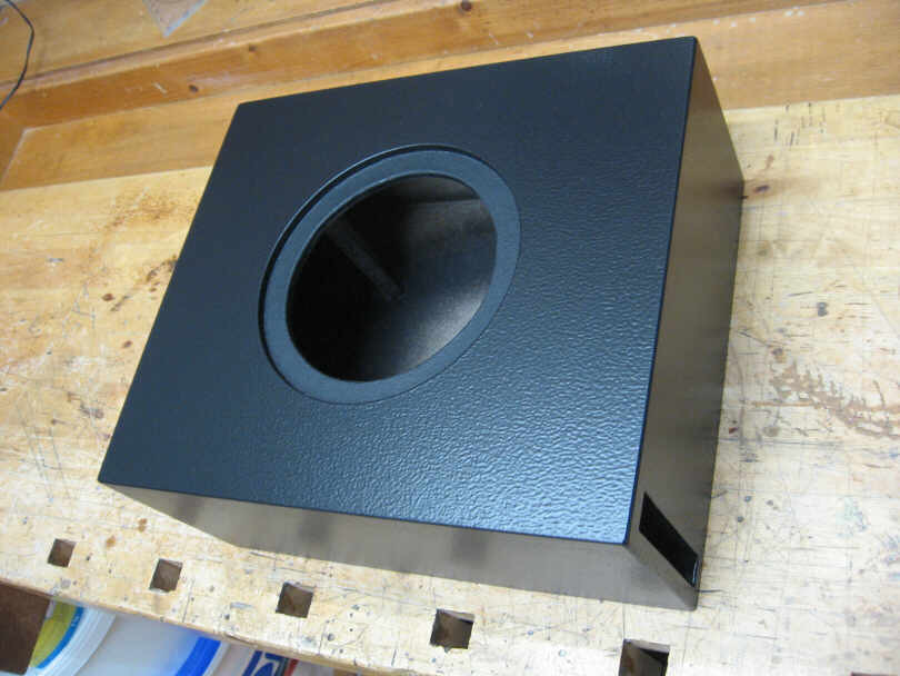 Insgesamt ist das Gehäuse aus 12mm MDF gebaut, welches hier passend zu den Sat's mit HPL beschichtet wurde. Alle Teile sind auf Gehrung geschnitten, so dass auch hier identisch zu den Satelliten "echte scharfe" Kanten entstehen.