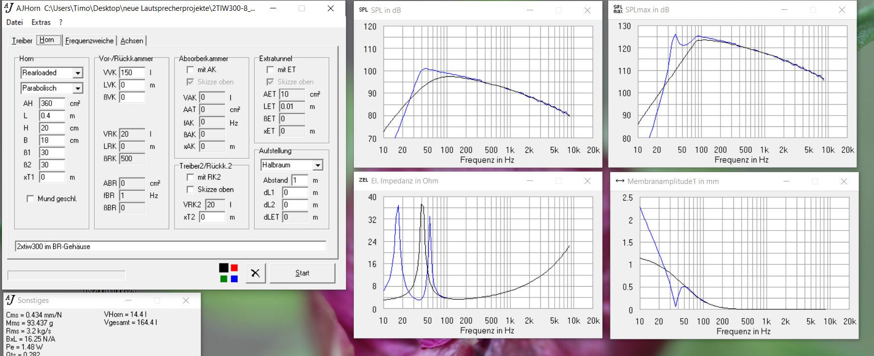 ich habe die Simulation der beiden TIW Bässe im Gehäuse nochmals gemacht, .. ich weiß dass die das AJhorn nicht zusagt, ... aber ich habe mit diesem eine sehr gute Erfahrung gemacht und die letzte Version, die man hier sieht, produziert hervorragende Simulationsergebnisse, die der Realität sehr nahe kommt.