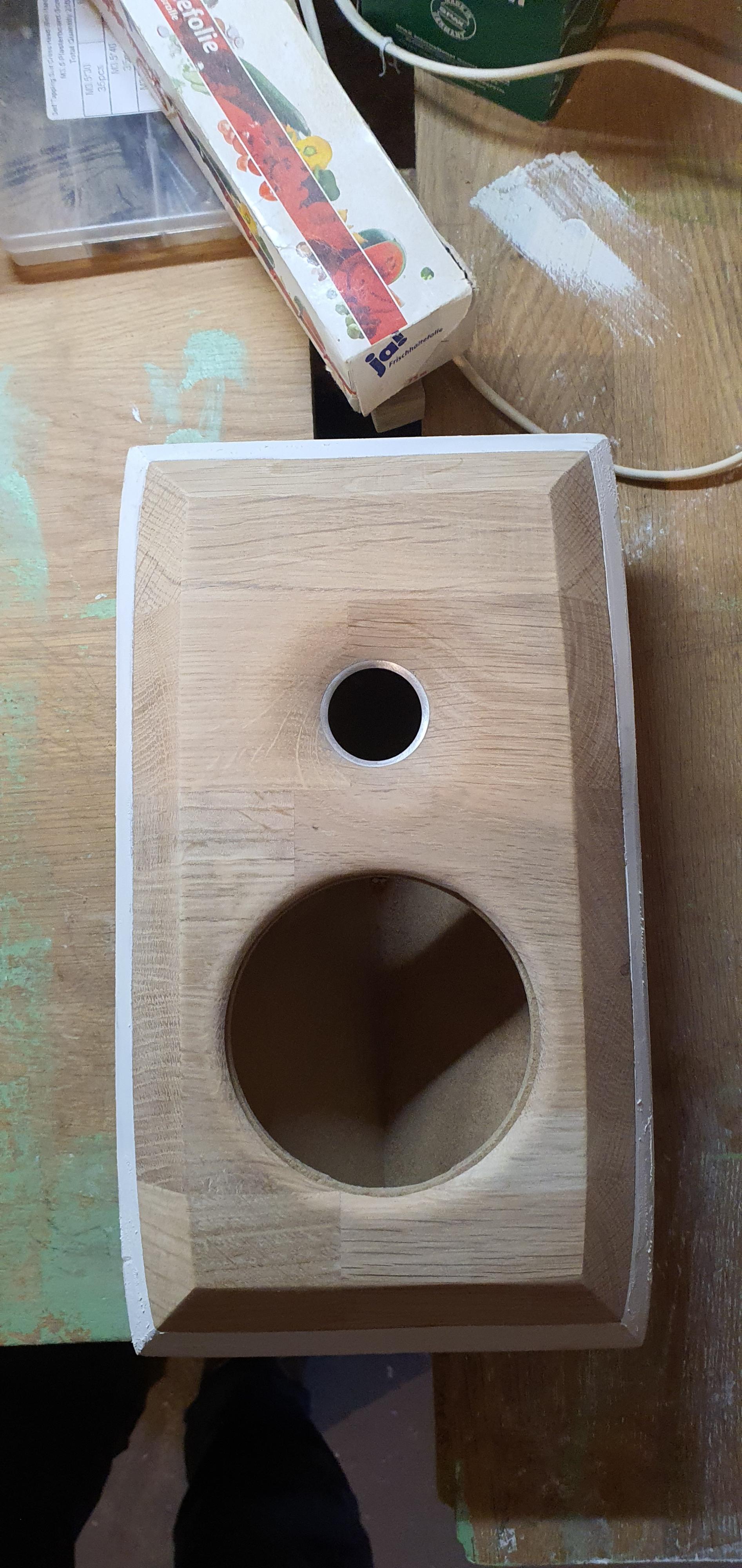 Als ich die Aria Light WG Variante als Rear Surround gebaut hatte, war die Idee für Ecki geboren. Der kleine Waveguide für den G20 erzeugt eine geeignete Abstrahlcharakteristik. Bis 40° kaum Pegelabfall, über 60° zunehmende Bündelung. Damit sollten Störungen durch Reflexion an den Wänden minimal sein.