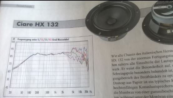 Bemerkung: Lt. K&T 6/2004: (..) ist ein enger Verwandter des Ciare HX 132: Bauteile wie Membran, Sicke, Spinne und Spulenträger sind augenscheinlich gleich. Das Messlabor belegt diese enge Verwandtschaftsbeziehung eindeutig, viele Messungen liefern ähnliche Ergebnisse. Es sind 3 Stück vorhanden.
