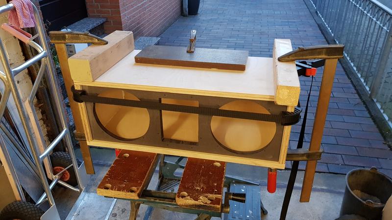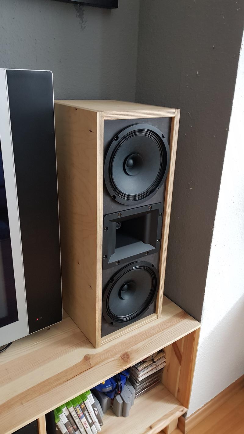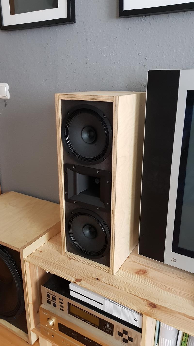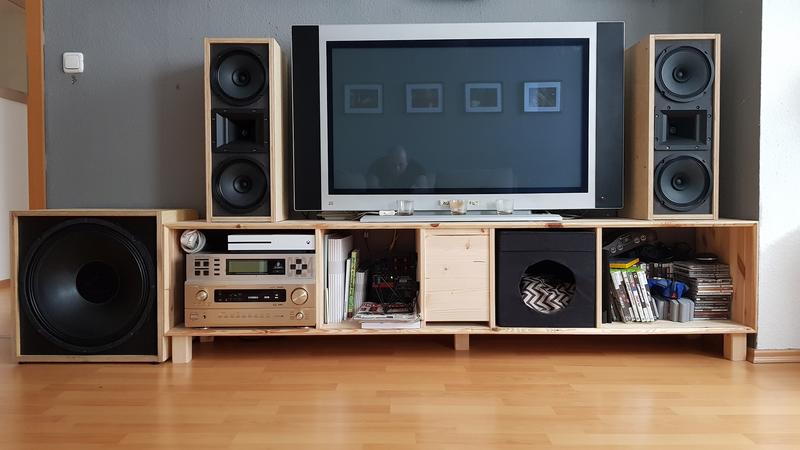 Die Gehäuse sind nicht perfekt, sollten eigentlich nur für den Übergang herhalten und bestehen aus 18 mm Multiplex mit einer Front aus 18 mm schwarzem MDF. Die Gehäuse wurden gewachst. Sind trotzdem ganz ansehnlich und wohnzimmertauglich geworden.