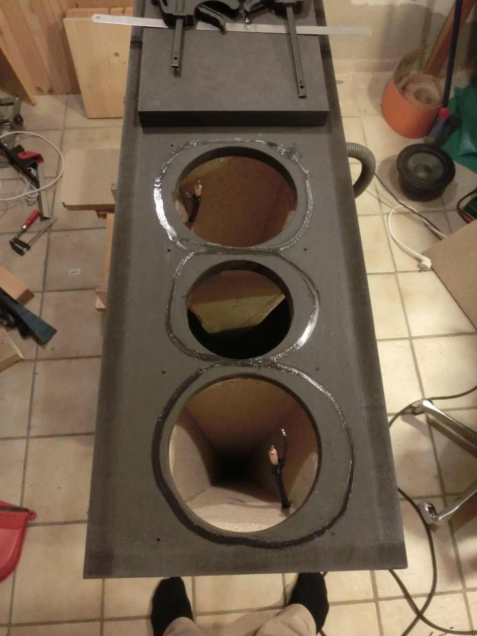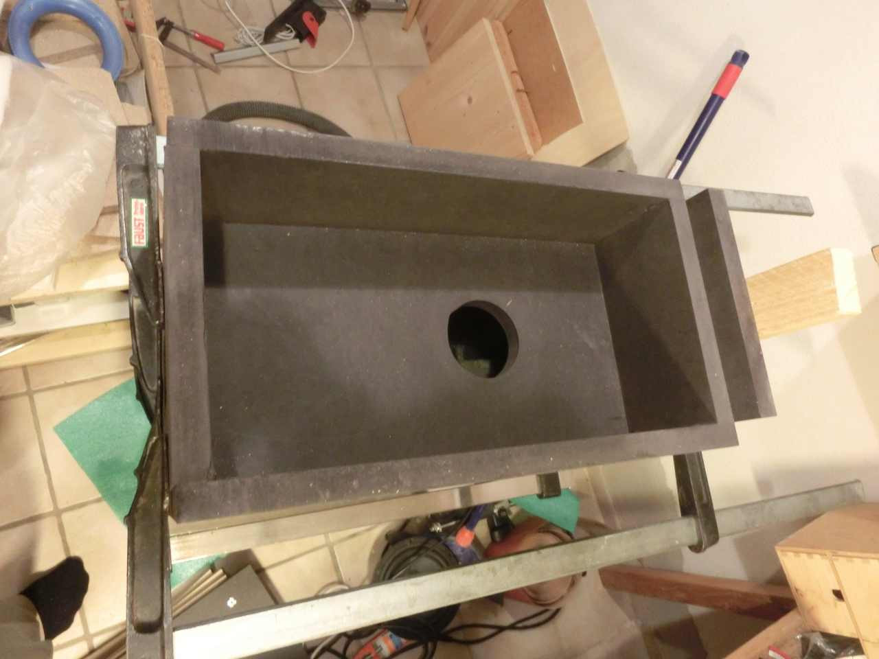 MDF 19 schwarz roh, die Front aufgedoppelt; der MHT-Teil ist extra festgeschraubt und mit Silikon luftdicht gemacht. Ich wollte mal eine Alu-Front, deswegen die Teilung.