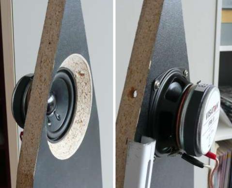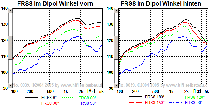 Der FRS8 wurde nach den vorhergehenden Erkenntnissen von hinten in eine schmale offene Schallwand eingebaut und gemessen. Der Frequenzgang muss noch mit einem Tiefpass erster Ordnung bei 200 Hz "waagerecht" gezogen werden. Dann ergibt sich weitestgehend konstante Direktionalität (CD) von 200-2000 Hz. Die darunter montierten W250 liefern diese CD bereits von 50-200 Hz. Ab 2 kHz übernehmen zwei Mini-Kalotten Rücken an Rücken. Die sind leider nicht von Visaton. Als Endergebnis erhoffe ich mir einen Dipol, der auch zur Seite und nach hinten "richtig" ist.