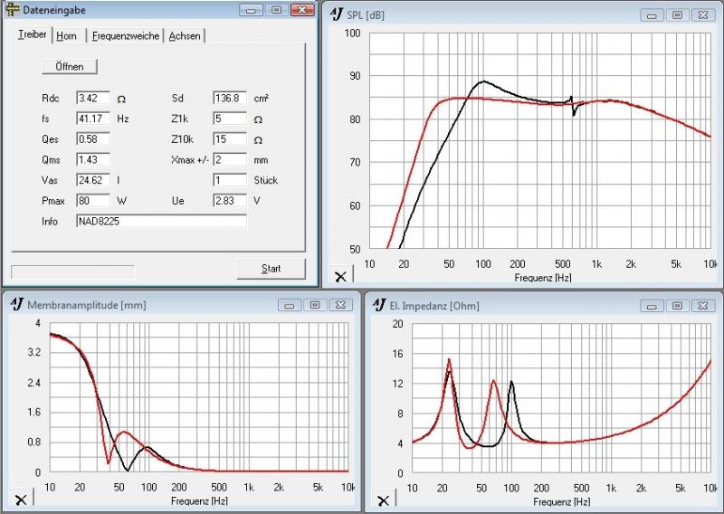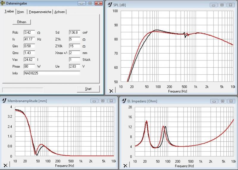 Zur Abstimmung kann ich leider nichts genaues sagen. In einer älteren Testzeitschrift habe ich einen Frequenzgang gefunden. Die Höcker im Impedanzgang waren bei ca. 90Hz und bei ca. 30Hz.