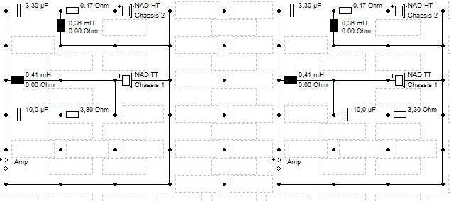 Die Weiche macht allerdings stutzig. Die Tieftonspule hat 0,41mH. Parallel dazu ein 10uF Kondensator und ein 3,3 Ohm Widerstand (in Reihe)