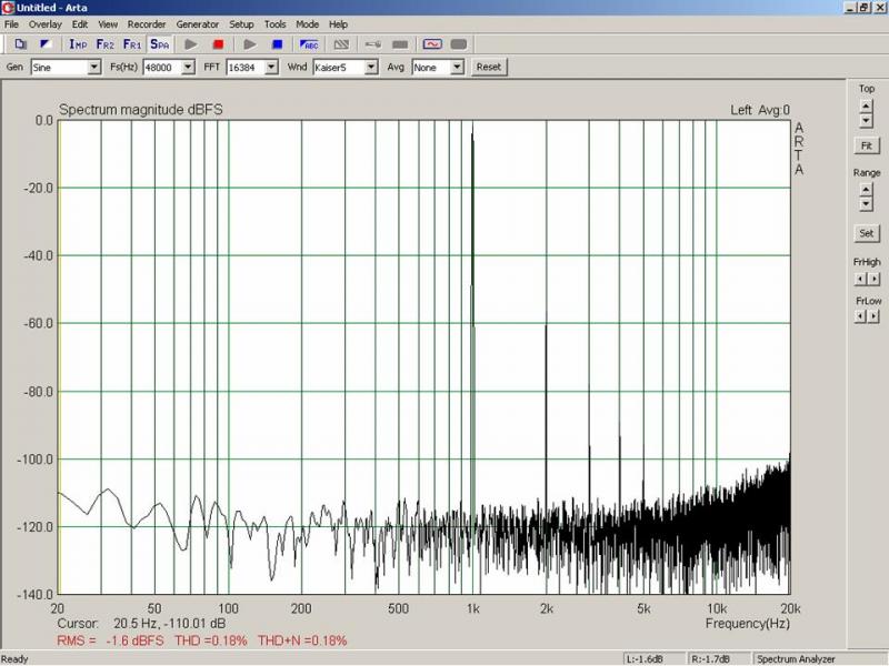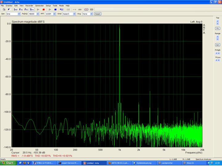 Zu Beginn wurde, wie im Kompendium beschrieben, die Soundkarte per Loopback-Messung auf die Probe gestellt, welche mit Paucken und Trompeten durch die Prüfung fiel, für eine Anwendung mit Arta absolut unbrauchbar, die Karte ist eine SoundBlaster B800, wie im Diagramm unten zu sehen sind Verzerrungswerte zu hoch (und bei 2,3 und 4kHz sind Störspitzen zu sehen, woher diese rühren und warum sie vorhanden sind, keine Ahnung)und der Frequenzgang alles andere als gerade. Wenn ich ehrlich bin habe so ein Ergebnis erwartet, nach Einbau dieser Karte, die eine Onboard-Karte ersetzt hat, klang alles sehr hell und "gesoundet", die Voreinstellungen der Klangänderungen sind quasi nicht nutzbar, dann wird alles sehr spitz und nicht mehr anhörbar, eine neue Karte muss her, morgen entscheidet sich welche verwendet wird, aber es wird eine USB-Karte werden um sie nicht in den Rechner einbauen zu müssen. Habe zwecks der Übersichtlichkeit und Fehlerminimierung vor die Arta-Messbox, die Soundkarte, den Mikrofonvorverstärker und den Messverstärker in ein Gehäuse einzubauen. Somit hat der "Messkoffer" dann nur noch Netzkabelanschluss, Lautsprecherausgang, Mikro-Eingang und USB Ein-Ausgang, alle anderen Verbindungen finden intern fest statt. Als Messeinheit dient der kalibrierte Messpack von Hifi-Selbstbau, schnelle Lieferung und saubere Beschriftung des kalibrierten Verstärkers, sehr empfehlenswert.