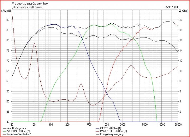 Der GF 200 ist ein Tieftöner und kein Mitteltonspezialist (hohes Membrangewicht) und sollte deshalb max. bis 400 Hz hoch laufen.