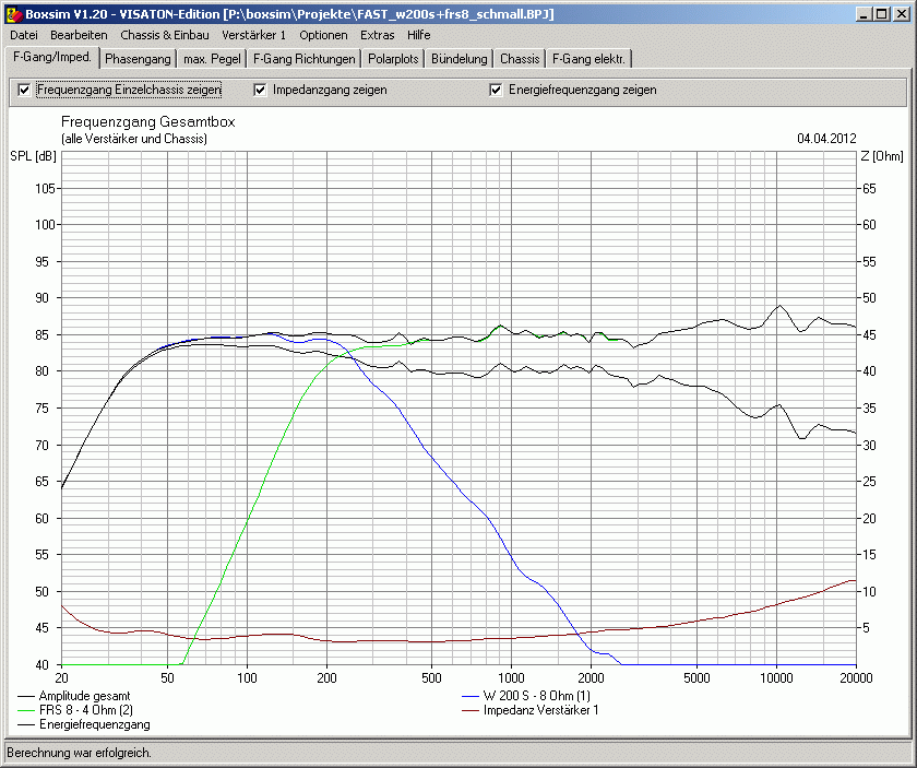 Ich beschäftige mich schon seit Jahren - ja fast schon Jahrzehnten - in wechselnder Intensität mit dem Thema Lautsprecherbau. Allerdings hauptsächlich als Schreibtischattentäter. Jetzt hab ich mich einmal aufgeschwungen ein Projekt zu präsentieren. Es handelt sich um eine 2-Wege-Kombination aus einem W200 und einem FRS8M, wobei der FRS8M relativ tief gekoppelt wird. Also eigentlich eine FAST. Das Ganze habe ich in ein relativ breites Gehäuse gepackt. Mich würde es sehr freuen einige Meinungen zu hören, bzw. würde mich zu zwei Punkten eine Hilfestellung freuen: 1) So um die 100Hz bekomme ich die Impedanz nicht ganz in den Griff, 3Ohm ist vielleicht ein wenig wenig. 2) Ich wollte zwei relativ günstige Chassis verwenden. Jetzt steht aber der (finanzielle) Aufwand bezüglich der FQW im Gegensatz dazu (hauptsächlich die großen Spulen). Wie gesagt, würde mich über zahlreiche feedbacks und inputs freuen.