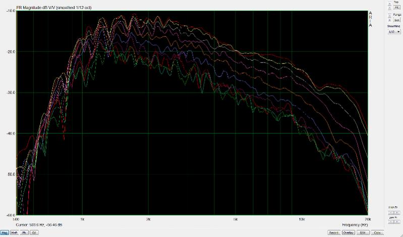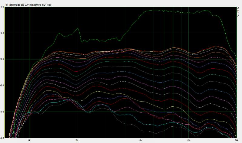 Auf den ersten Blick ist ein schönes "Constant Directivity" zu erkennen. Zwischen 3 und 5kHz ist das Rundstrahlverhalten allerdings über dem Schnitt. Bei 2 kHz ist wiederum mehr Bündelung vorhanden. Ich weiß nicht so recht wie ich das Interpretieren soll. Ich habe nur die Erfahrung gemacht das sich bei dieser Abstimmung kein Wohlklang einstellt weil S-Laute stark zischeln. Ein Absenken um 5dB auf Achse bei 4 - 5,5kHz erzeugt aber sehr wohl angenehme Klänge.