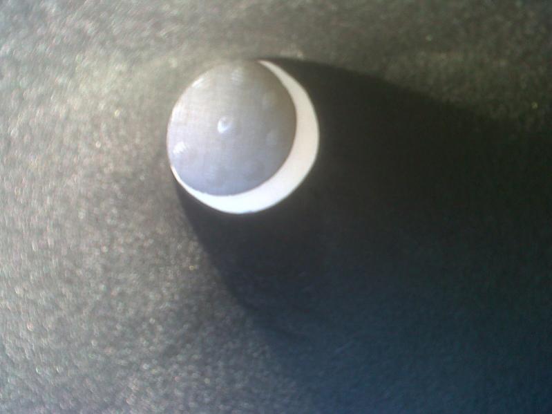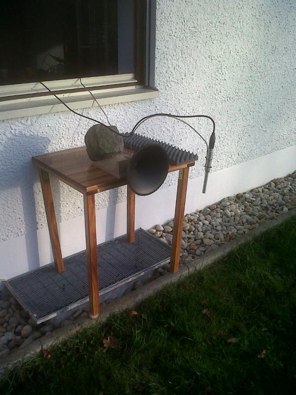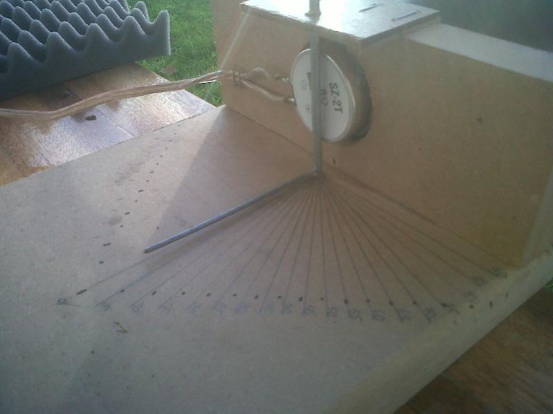 ) eingeklebt und mit Alubutyl beklebter Pappe die Kante beim Gewinde egalisiert. Das schaut dann so aus:Um halbwegs präzise Winkelmessungen zu machen, habe ich hinter dem HT den Drehpunkt für den Mikrofonschwenkarm gesetzt. Es bot sich im Eifer des Gefechts einfach an, das schon vorhandene provisorische Trötenhalterbrett als Winkelmesser zu gebrauchen. Im nachhinein würde ich den Drehpunkt eher auf Schallwandebene legen, weil dann 90° auch 90° sind und nicht wie hier... 70° entsprechen echten 90° ! Bei 90° auf der Skala ist das Mikro dann hinter der Schallwandebene... Seis drum.. quick and dirty eben