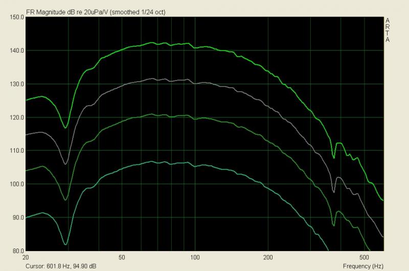 Hier mal der Vergleich des Beispieltreibers mit 200 cm² Membranfläche in BR mit den Kanalquerschnitten 38,5 cm² (7 cm Rohrdurchmesser; schwarz und rot) und 19,6 cm² (5 cm Durchmesser; grün und blau) mit und ohne Berücksichtigung der durch die Faustformel ermittelten Verluste: