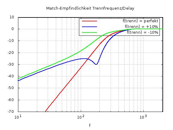 grün - Trennfrequenz für gegebenes Delay 10% zu niedrig