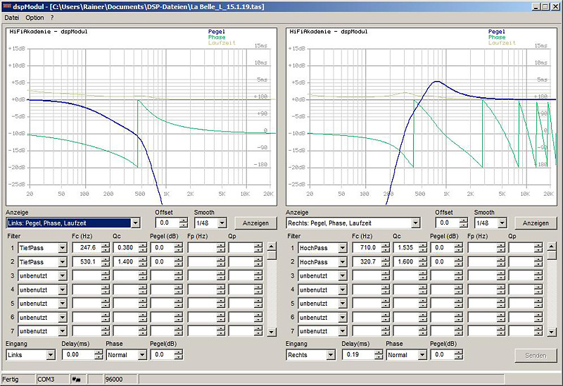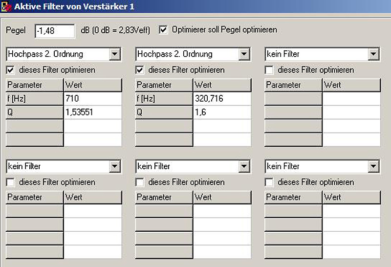 Was mich irritiert, dass die Parameter (Werte für Frequenz + Q) nach der Optimierung für die je 2 Tief- und Hochpassfilter 2. Ordnung untereinander so stark abweichen (s. Bilder). Diese ermittelten Werte sollten so auch in den DSP des Amp übertragen werden.