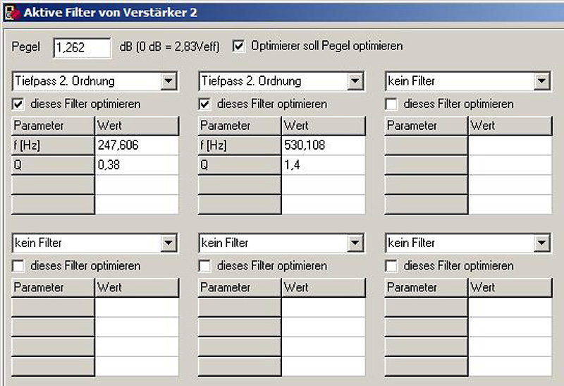 Das neue Boxsim 2.0 läßt jetzt auch die Optimierung (Pegel, Parameter) der aktiven Filter zu. Durch kleinere manuelle Änderungen der Parameter kann der gesamte Frequenzgang noch optimiert werden.