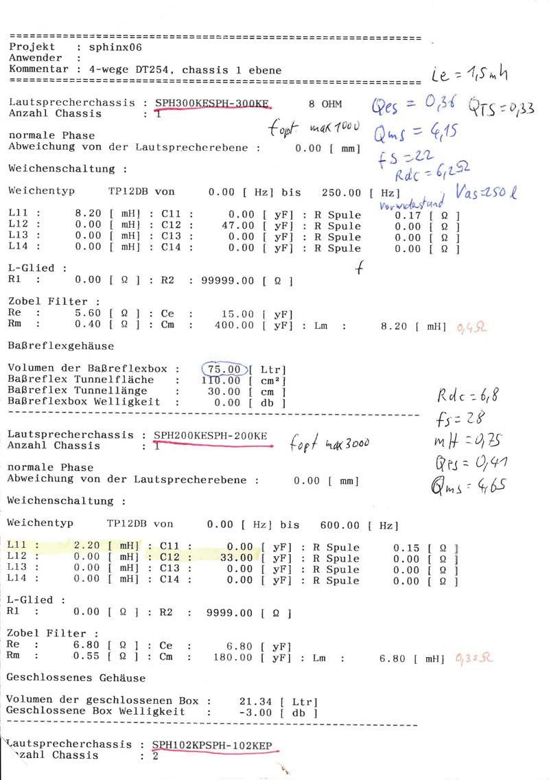 Da ich jetzt Rentner bin, habe ich mehr Zeit, mein durch Beruf etc. vernachlässigtes HiFi Hobby wieder aufzunehmen. Aktuell habe ich Fragen zu einer 4-Wege Box, die ich vor Jahren geplant und simuliert hatte, aber nicht realisieren konnte. Ich hatte dafür Monacor Chassis eingeplant und mir die Daten inkl. Frequenz- und Impedanzkurven, leider ohne Phasengang, in .ipt Files bereitgestellt. Das Programm hieß SPEAKER von 1993 CS Software und war, wenn ich mich recht erinnere, ein Vorläufer von Boxsim? Nach einiger Simulation und Optimierungsschleifen waren die Ergebnisse eigentlich sehr schön. Siehe auch die Ausdrucke im Anhang. Leider ist die Software durch PC Wechsel verloren gegangen.