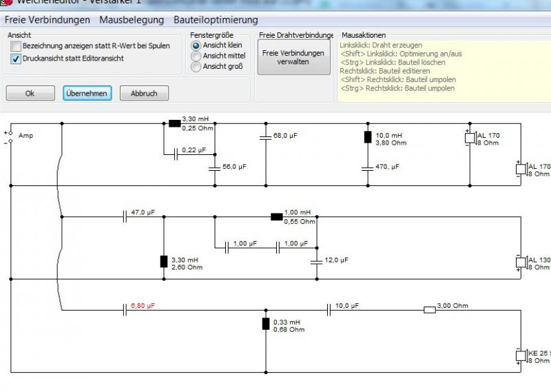 0,22µF und nicht 22µF. Paralel zur Tieftonspule. Na dann bist doch ein Stück weiter gekommen. Ich würde mir einen Visaton g 25 ffl ausborgen und ausprobieren. Wo bist Du zu Hause? Wenn NRW dann gibt es keine Probleme. Am besten mit ARTA messen was da zischt.Es ist meine Meinung, die ohne Angaben von Gründen geändert werden kann. Fehler oder Irrtümer vorbehalten! Für die Richtigkeit der Angaben kann keine Gewähr übernommen werden
