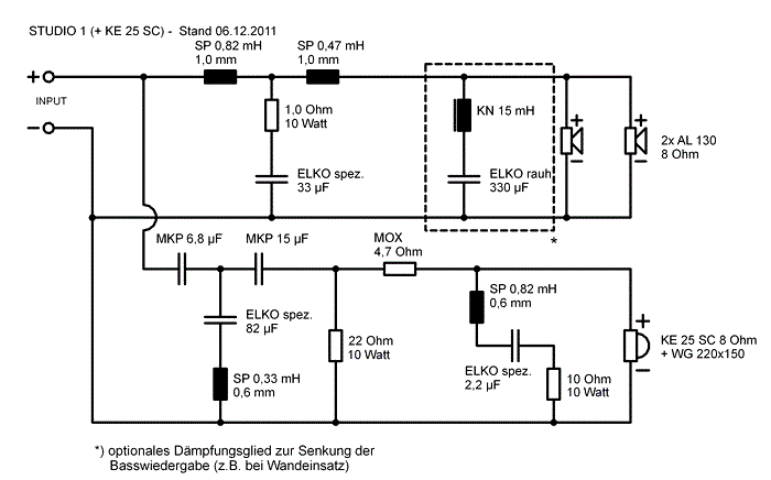 Zur Senkung der Basswiedergabe (z.B. bei Wandeinsatz) kann der gestrichelte Bereich (KN 15 mH / 330 µF) eingefügt werden (Absenkung um ca. 1,5 - 2 dB ab 200 Hz abwärts).