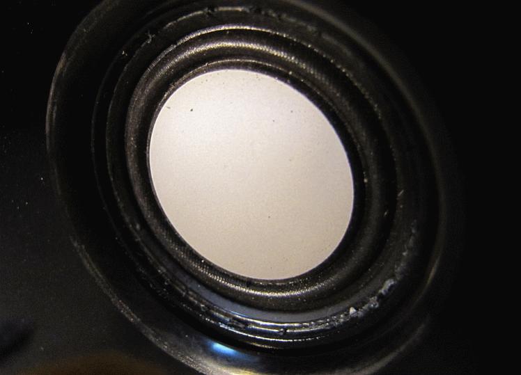 Foto zeigt die entgitterte Ke meiner Bijous. Ganz außen ist die Deckplatte aus Acryl, dann sieht man eine unsaubere Linie - dort sitzt das Gitter mit etwas dauerelastischer Knete auf. Da ist noch viel Luft zur Mebran und besonders, wenn das WG auf dem Gitter aufsitzt.