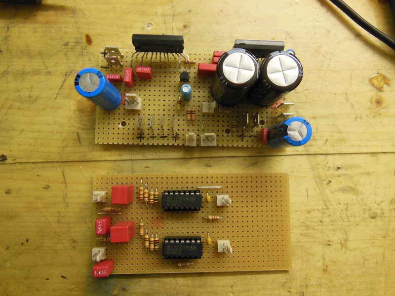 Der linke Amp ist ein TDA8560Q mit 2x40W (60W max), der rechte ein TDA1562 mit 70W. Den linken habe ich noch um den Tiefpass (2,9K-Ohm, 0,33µF) erweitert, was unten mittig ab dem rechten 3-poligen PSK-Steckkontakt zu sehen ist (verläuft nach oben zum Eingang). Der mittlere 2-polige Port geht dabei zum 10K-Poti zum Einstellen der Frequenz.
