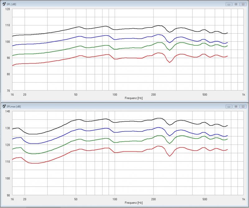 Ich habe beides mal mit Boxsim simuliert, also einfach eine Box eigegeben von 300cm Höhe, 460cm Breite was dem Wandstück enstpricht in der die Geschichte eingebaut wird. Dort habe ich dann einmal die TL's eingetragen(große unbedämpfte BR Gehäuse mit den Eckdaten aus AJHORN6[Hornvolumen+Absitmmfrequenz] sehen dann bei Boxsim sehr ähnlich aus in der Simulation) und einmal eben die 10xW300(Position alle auf 1m Höhe und dann alle 50cm ein Treiber). Da Boxsim nur 8 Chassis simulieren kann habe ich die Chassisparameter so angepasst das es 10 Chassis entspricht vom Maxpegel her. Wiegesagt das ganze soll ja nur mal als grober Vergleich dienen! Hintergedanke der SBA Variante ist eigentlich nur das es tiefer runter spielen kann als eine TL Variante, hier muss ja unterhalb der Abstimmfrequenz der Subsonic greifen... Es wäre natürlich eine feine Sache wenn man mit der SBA Variante auch noch 10hz wiedergeben könnte Achso, 10x W300 deshalb weil sie kostemäßig ca. 4 TIW200 bzw 2x TIW300 entsprechen und das ist der gesetzte Preisrahmen. Das SBA müsste natürlich entzerrt werden braucht also eine Anhebung untenrum. So langer Text, hier noch 2 Bildchen.