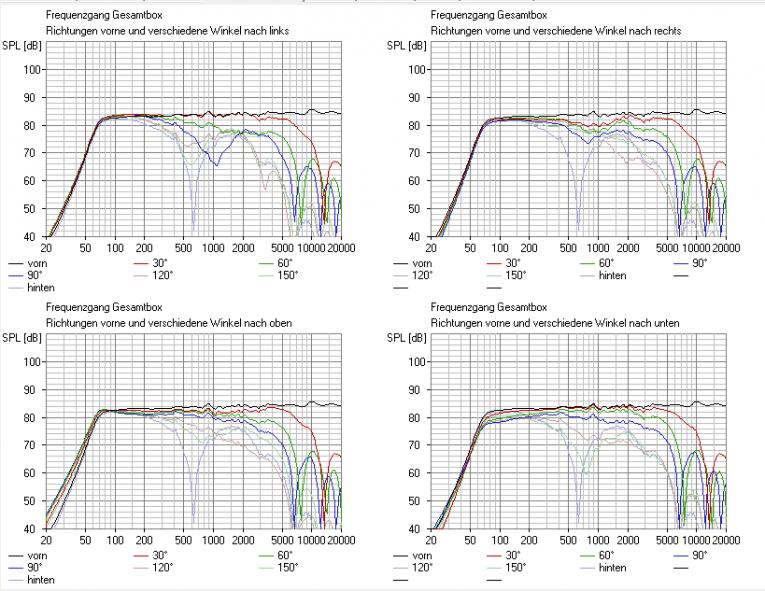 Das Gesamtvolumen liegt irgendwo um 16-18 Liter. Habe in der Simu 15 beim FR10 und 5 beim FRS8 eingetragen. Beim FRS8 wirkt sich das Volumen sowieso kaum aus, da er ja nach Unten hin beschnitten ist. Und beim FR10 machts gerade mal 1 dB mehr aus um 80 Hz wenn das Volumen von 10 auf 20 ansteigt..also alles unkritisch.