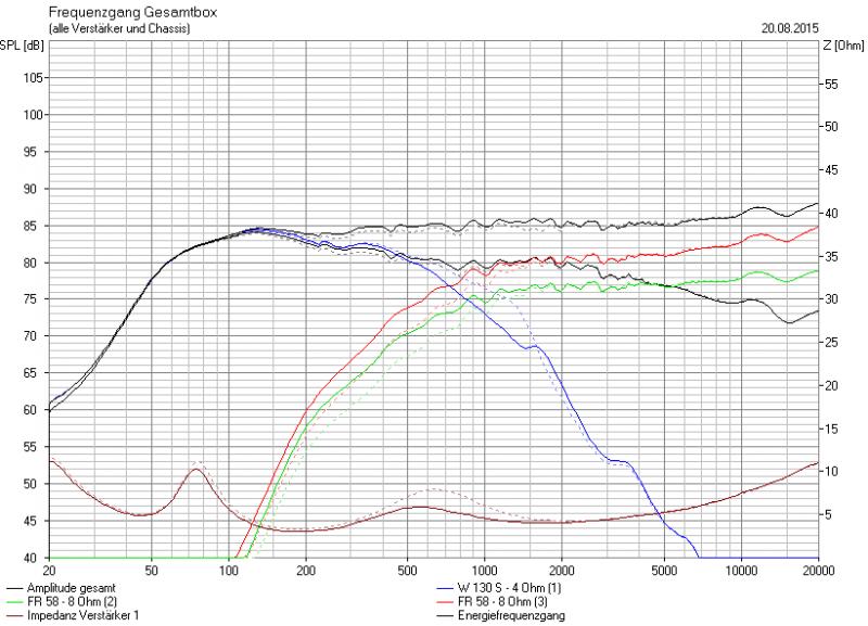 Frequenzgang gestrichelt: mit der deaktivierten Korrektur bei den FRs (siehe Screenshot Weiche)