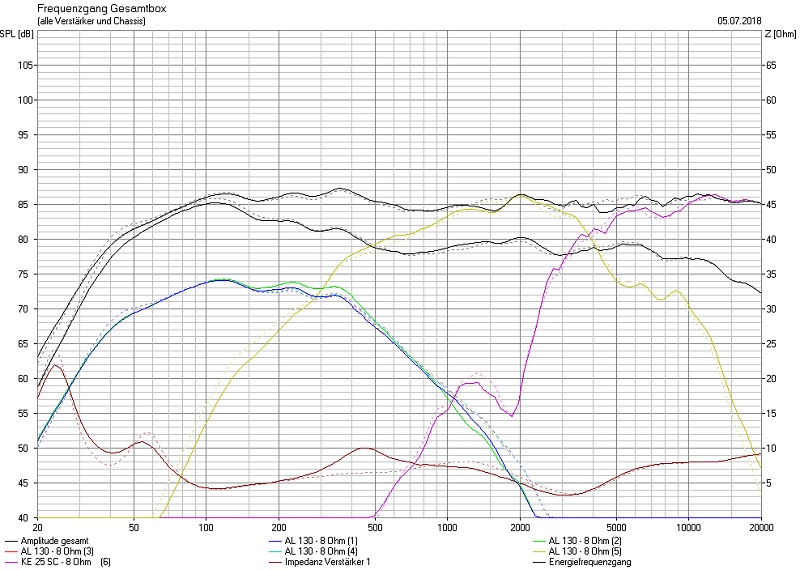 Frequenzweiche könnte man aus meiner Sicht eigentlich auch so lassen, evtl. den Kondensator vorm Mitteltöner auf 33mF reduzieren. Selbst unter 30° schaut das Ganze noch gut aus, bricht erst gegen 60° ein, aber da sollte ja eigentlich auch niemand mehr sitzen.