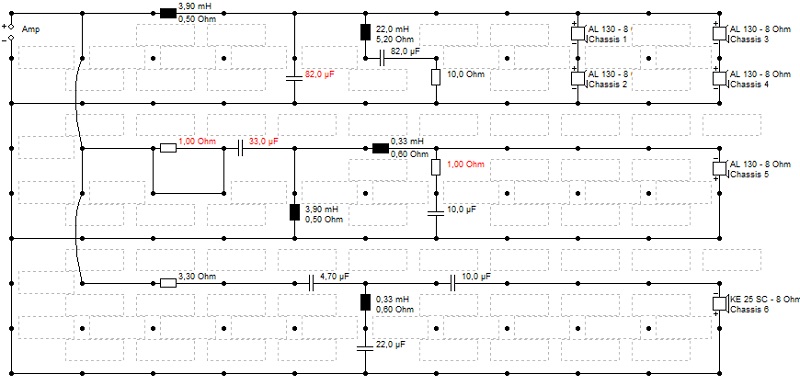 Mit den Änderungen hast du trotz der anderen, größeren Schallwand des Centers einen sehr ähnlichen Frequnzgang auf Achse und identische "Filterflanken". So würde ich die Centerweiche bauen Den Rest regelt eh die Einmessung.