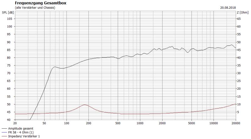 Je ein FR 58 (4 Ohm) links und rechts außen in einem Gehäuse mit 53x7x38cm (BxHxT) mit BR-Abstimmung zu je 4,5 l. So ich die BR-Berechnung in Boxsim korrekt genutzt habe, ergäbe das bei einem ungekürzten BR 6.8 eine Abstimmung auf 66 Hz.