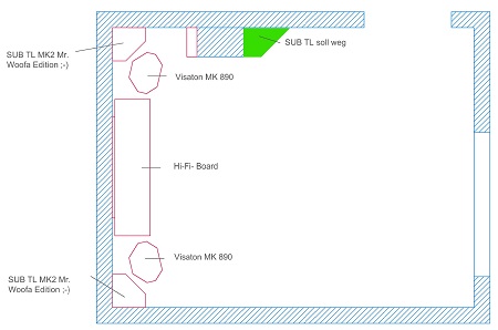 Als neuer Standort würde ich gern 2 mal die "Neuentwicklung" vom TL Sub MK 2 in der Mr.Woofa Ausführung bauen. Meine Bedenken bei dieser Aufstellung sind: ist die dichte Aufstellung der Monitor 890 vor dem TL problematisch oder eher zu vernachlässigen?