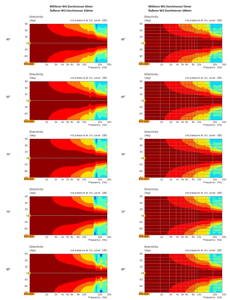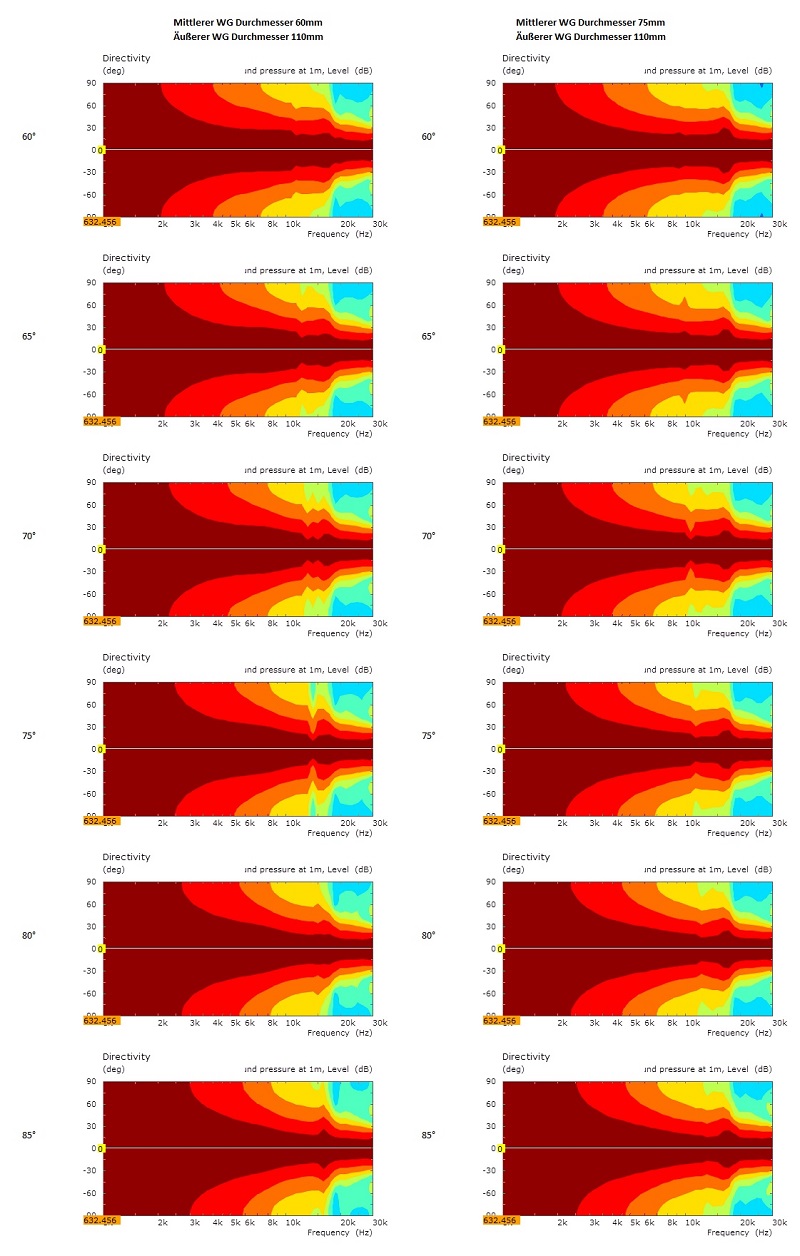 Erkenne ist, dass das WG mit größeren mittleren Durchmesser eine Aufweitung bei ca. 16kHz hat. Diese Aufweitung ist bei dem stärker zulaufenden WG mit 60mm mittleren Durchmesser nicht so stark ausgeprägt. Ich würde daher vorschlagen, jetzt eine Versuchsreihe mit kleinerem mittleren Durchmesser zu machen - z.B. 55mm (und vielleicht noch 50mm).