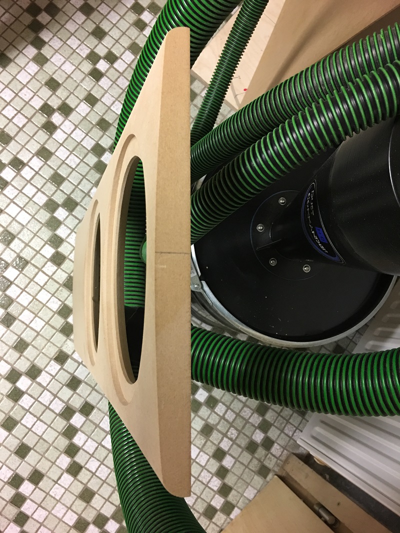 Der große Bogen (etwa 2,5Meter) erstreckt sich über die gesamte Fläche der Schallwand. Die Radien außen sind R=15mm. Ursprünglich wollte ich da noch mehr, sah irgendwie nicht aus. Ich hoffe das lässt sich so auch für den MT/HT-Bereich umsetzen. Wenn es Probleme gibt, muß man schauen wie es gelöst werden kann. Es ist ja noch nix verleimt und wird erst getestet.