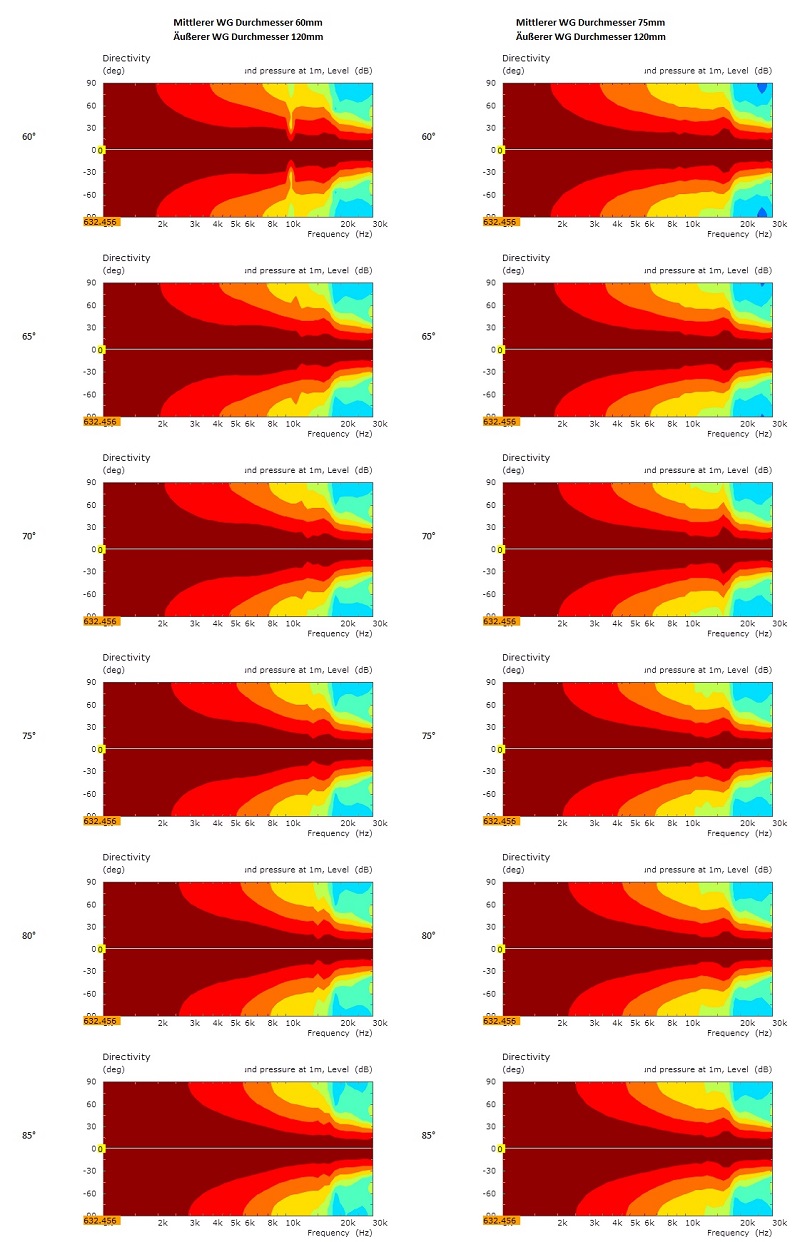 Erkenne ist, dass das WG mit größeren mittleren Durchmesser eine Aufweitung bei ca. 16kHz hat. Diese Aufweitung ist bei dem stärker zulaufenden WG mit 60mm mittleren Durchmesser nicht so stark ausgeprägt. Ich würde daher vorschlagen, jetzt eine Versuchsreihe mit kleinerem mittleren Durchmesser zu machen - z.B. 55mm (und vielleicht noch 50mm).