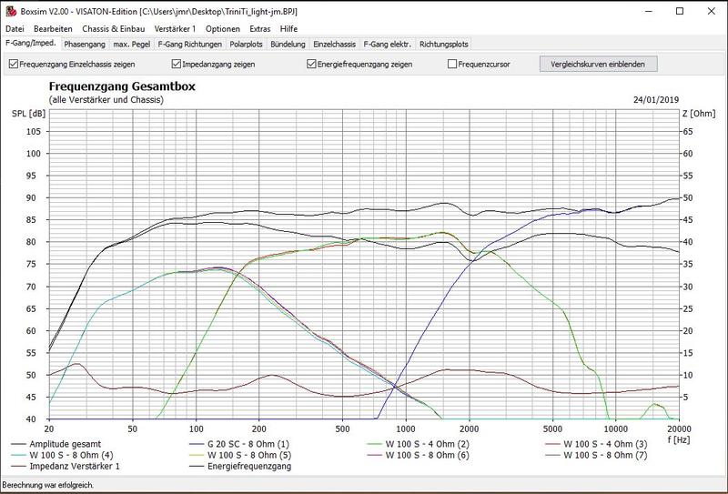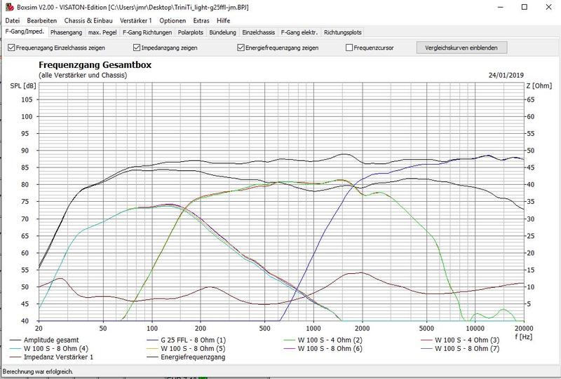 mich plagen schon seit Wochen wieder Hifi-Geister. Diesmal steht auf der wishlist die TriniTi, aber aus Budget-Gründen eine light Version. Die TI’s würde ich durch W100S ersetzen und die Ke durch die G20SC (aus optischen Gründen gern auch mit Waveguide). Die Schallwand würde ich gern etwas schmälern. Ich habe Boxsim schon mal mit der Weiche beauftragt. Um eine `Grundlage´ zu schaffen hatte ich vorher die echte TriniTi als BR simuliert und dann versucht eine ähnlich Kurve zu generieren.