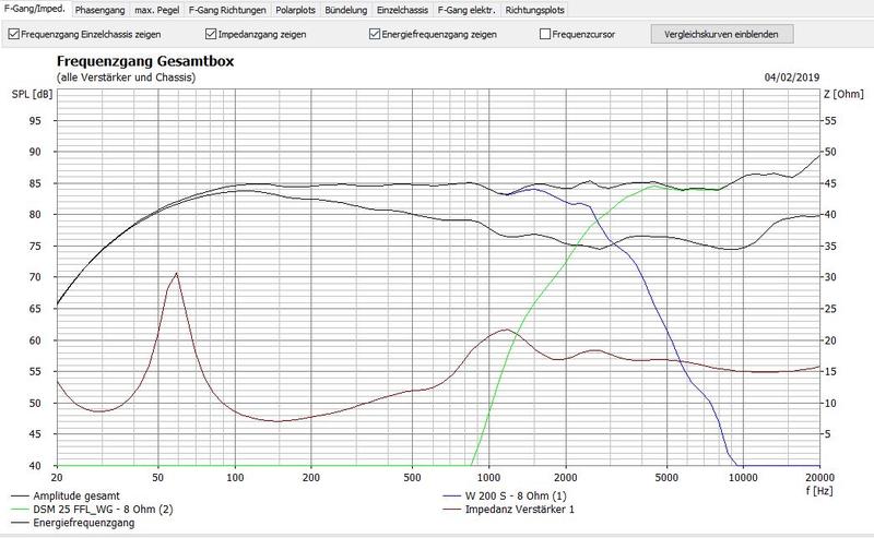Zum Vergleich, die Studio 2 kann auch nicht mehr Maximalpegel. Natürlich kann man die Box auch mit der G 25 bauen, aber es gibt ja Liebhaber der DSM, für die war dieser "Service" gedacht. Die können ja auch die Superhochtonbremse in meiner Weiche weglassen, dann ist es schön "flirrig" Meine Empfehlung war ja auch Heimkino, also mit einem Sub, der ja die W 200 entlastet.