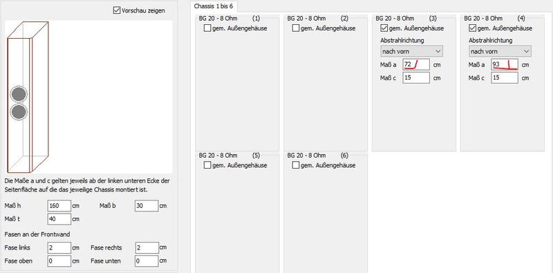 er hat beide BG 20 mittig gesetzt --> 72 und 93 cm hochZitat von F.H. Beitrag anzeigenZurück zur eigentlichen Frage: Jamas Weiche ist bestechend einfach. Das gefällt mir sehr gut. Allerdings sehe ich das Problem, dass im Hochtonbereich beide BG 20 parallel laufen. Das führt bei hohen Frequenzen zu einer extremen Bündellung in der Vertikalen. Das bedeutet, die Boxen müssen in der Höhe sehr genau ausgerichtet werden.